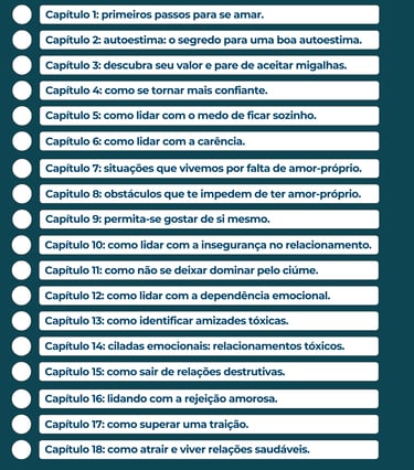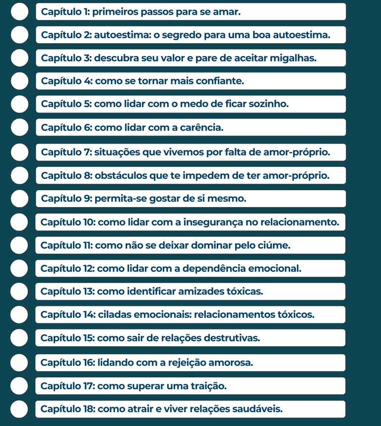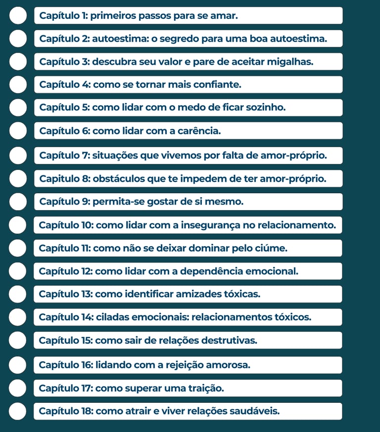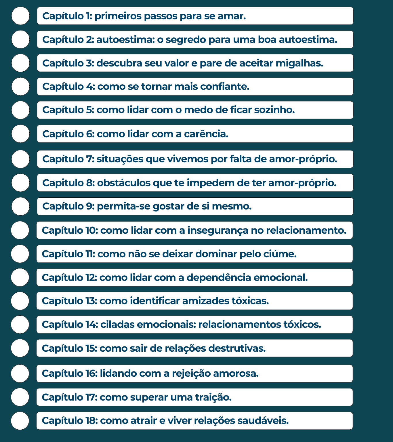 As estratégias ensinadas nesse livro digital funcionam tanto para você que nunca conseguiu se amar quanto para você que acabou perdendo sua autoestima e amor-próprio por conta de uma relação amorosa.