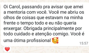 O meu método é um método de intervenção. Tenho espaço para te guiar, para te dizer o que você precisa ouvir, e para te mostrar o que fazer (e como fazer). Nada de teoria vaga ou deixar nas entrelinhas.